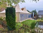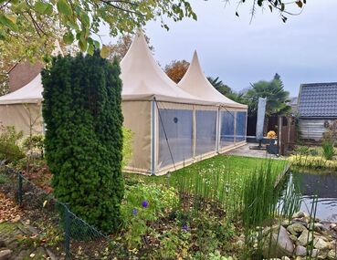 Onze zandkleurige pagodetenten worden standaard geleverd met 2 panorama- en 2 dichte zijwanden.