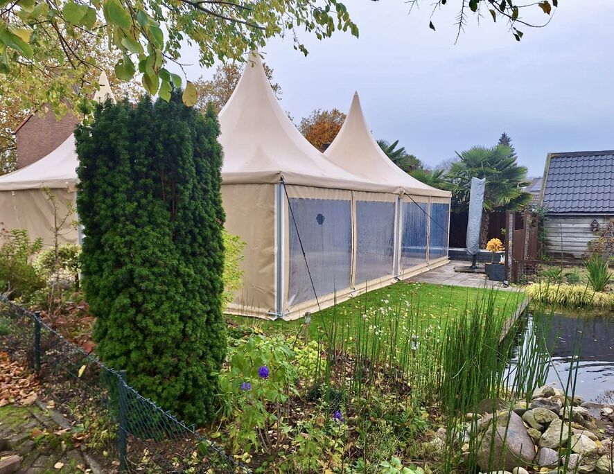De pagode tenten zand zijn uitermate geschikt voor een stijlvol privéfeest of zakelijke gelegenheid. De wind- en regenbestendigheid van deze pagodetenten is echt uitstekend. Een groot voordeel van deze afmeting pagodetent is dat je een vrije overbrugging hebt van 5 meter. Door één of meerdere van onze pagodetenten te huren, til je je evenement naar een hoger niveau! De pagodetenten hebben een hoog puntdak en zijn onderling makkelijk te koppelen. Degelijk en met karakter, dat is wat onze pagodetent kenmerkt!