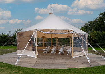 Om de tent goed te bouwen heeft u dus minimaal 11 x 11 meter nodig.