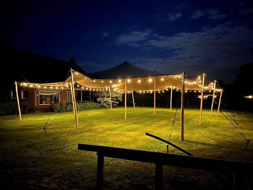 Om de tent goed te bouwen heeft u dus minimaal 11 x 16 meter nodig.