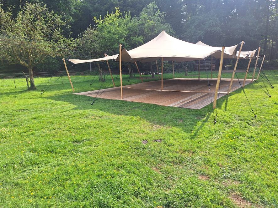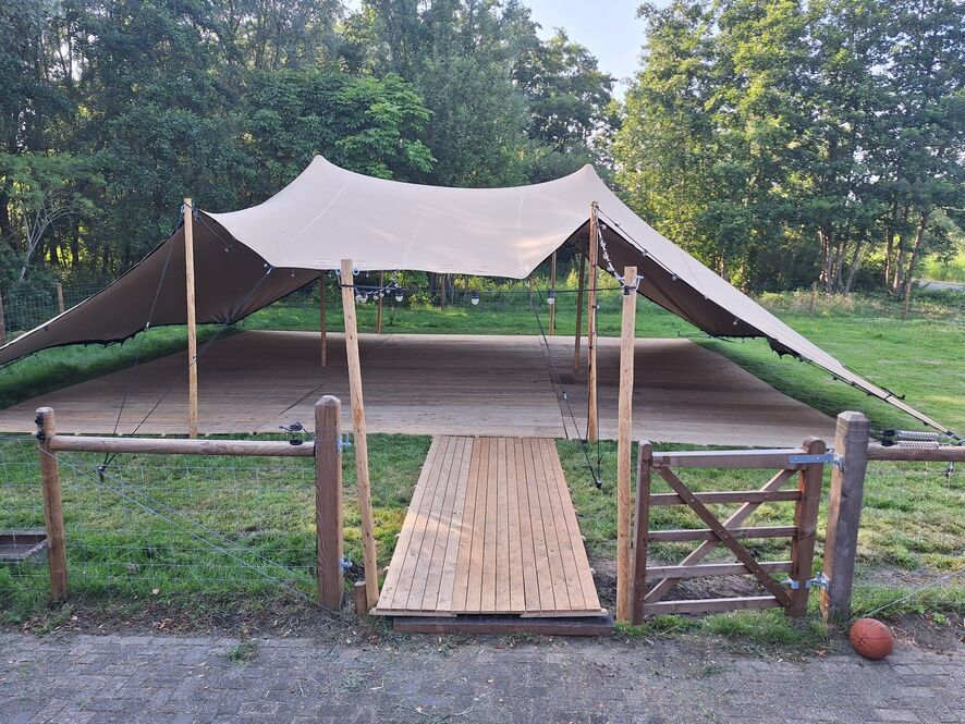 Let op: Om de tent te bouwen is er rondom de tent een meter extra afspanning nodig.